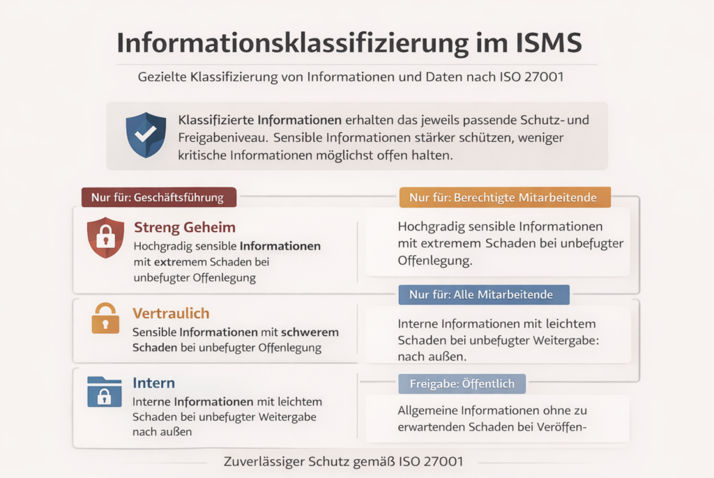 Die Einführung einer Informationsklassifizierung ist für viele Unternehmen ein wichtiger Schritt auf dem Weg zu einem strukturierten Informationssicherheitsmanagement. Besonders im Kontext der ISO/IEC 27001 – Information security management systems wird deutlich, dass Informationen selbst als schützenswerte Werte („Assets“) betrachtet werden müssen. Die Norm definiert Anforderungen an ein Informationssicherheitsmanagementsystem (ISMS) und unterstützt Organisationen dabei, Informationssicherheitsrisiken systematisch zu identifizieren, zu bewerten und geeignete Maßnahmen umzusetzen.